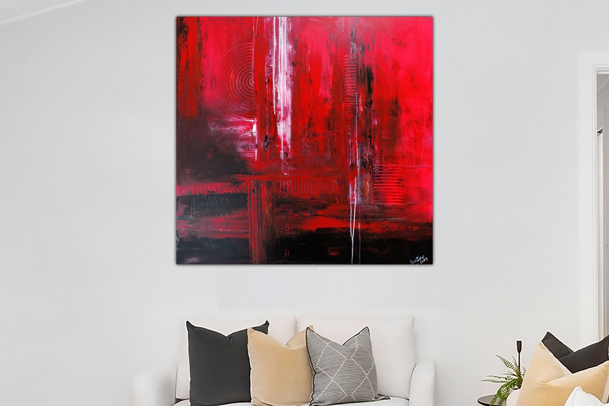 Ein rotes Gemälde in Acryl kann vielfältige Themen und Motive umfassen, von abstrakten Formen und Mustern bis hin zu realistischen Darstellungen von Landschaften, Porträts oder Stillleben. Die Wahl des Motivs und die Art und Weise, wie die Farbe Rot eingesetzt wird, hängt von der künstlerischen Vision und dem gewünschten Ausdruck ab.