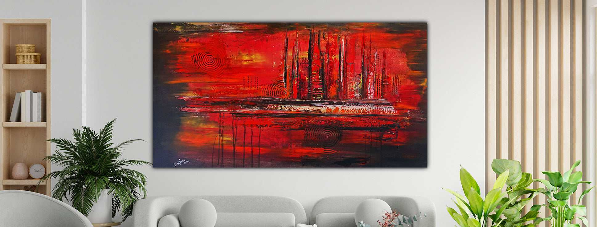 Rote Kunstbilder sind Ausdrücke kreativer Gestaltung, bei denen die Farbe Rot im Acrylbild im Mittelpunkt steht. Rote Gemälde wirken leidenschaftlich, lebendig und kraftvoll, und können verschiedene Emotionen und Botschaften vermitteln. Rote Wandbilder symbolisieren häufig die Liebe, Leidenschaft, Energie, aber auch für Wut, Gefahr oder Aufregung. Rote Bilder sind sehr ausdrucksstark und dominierend.